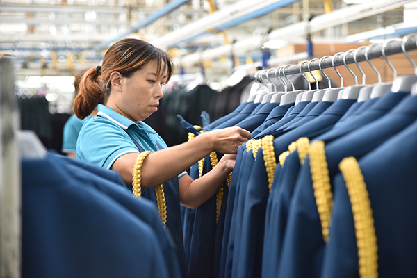在生产组织中,际华3502公司使用了大量的模板和运模机,保证了2万多套件服装同一部位制作统一。一分厂使用了勾前门模板和自动运模机,以前需要4个人完成的工序,现在一个人可以操作左右两台自动运模机。