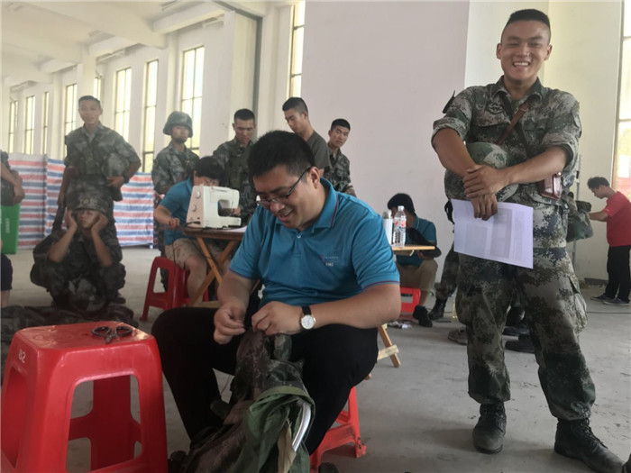 烈日似火,汗流成河。7月9日,服务团队从南京出发,行驶近千公里,抵达首站——福建某集团军驻训地,拉开了万里行服务序幕。七月,正值伏天,他们辗转于祖国的东部地区,抵抗着三伏天所带来的极度“烤”验。驻训地基建设施简陋,服务团队多数情况下都是在仅能遮阳的帐篷中为官兵修补服装、鞋子及携行具,有时候条件不允许,只好在高温四十度下找树荫等遮阳处进行服务,在时下高温酷暑的“三伏天”里,数分钟便让人汗流浃背,看着损坏严重的一件件待修军需品,为了当天能够完成全部送修物品维修,节约时间,多服务几个部队,大家不顾高温与劳累,按照官兵需求全神贯注进行修补,力求官兵们能够穿上舒适的服装鞋靴,用上结实的装具。身上的衣服湿了又干,干了又湿,汗水湿透的背后,是我们际华人对默默守护祖国的最可爱的人致以的崇高敬意。除了高温,还有台风。7月,台风接踵而至,虽然带来了阵阵清凉,但也携来了狂风骤雨。不巧的是,两次台风登陆的地点和时间正同服务地点重合,为团队服务与转移带来了不小的困难。一次,在福建,为了躲避台风玛丽亚登陆,服务团队不得不调整计划,放弃有限的休息时间抓紧做好服务后,连夜转场。夜晚,服务团队顶着狂风暴雨,走着山路,跟台风赛跑,凭着司机师傅娴熟的技能和队员强大的心理素质,有惊却无险。正是:服务不怕远征难,万水千山只等闲。