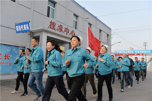 8点20分,职工环厂长跑比赛活动准时开始.鲜红的旗帜,蓝色的工装,整齐的方阵,活动现场弥漫着新年浓浓的暖意。“百年军企,特色纺织”、“诚信、感恩、务实、奋进”、“零九是我家,今天要奋发”等口号响彻天空,表达了零九人的壮志情怀,迎接新年充满了信心。
