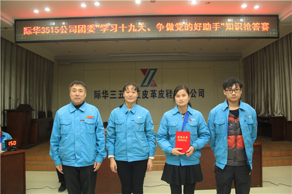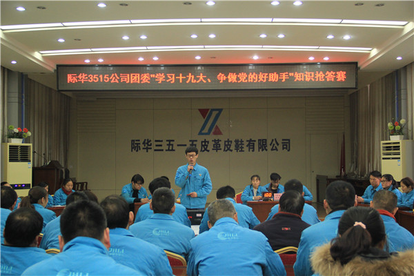 “青年兴则国家兴,青年强则国家强”,为深入学习贯彻党的十九大精神,引领企业团员青年,坚定信念跟党走,青春建功新时代。11月30日下午,际华3515公司团委在多媒体会议室举办了以“学习十九大 争做党的好助手”为主题的知识抢答赛。3515公司党委副书记、工会主席韩立平现场观摩比赛并作重要讲话,部室、研发、经营等党支部书记及各单位相关人员60多人观看抢答赛。