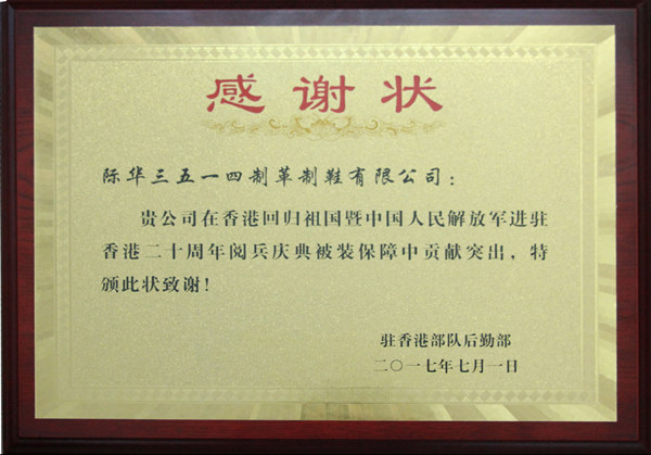 驻香港部队后勤部向际华3514公司发来感谢状及感谢信
