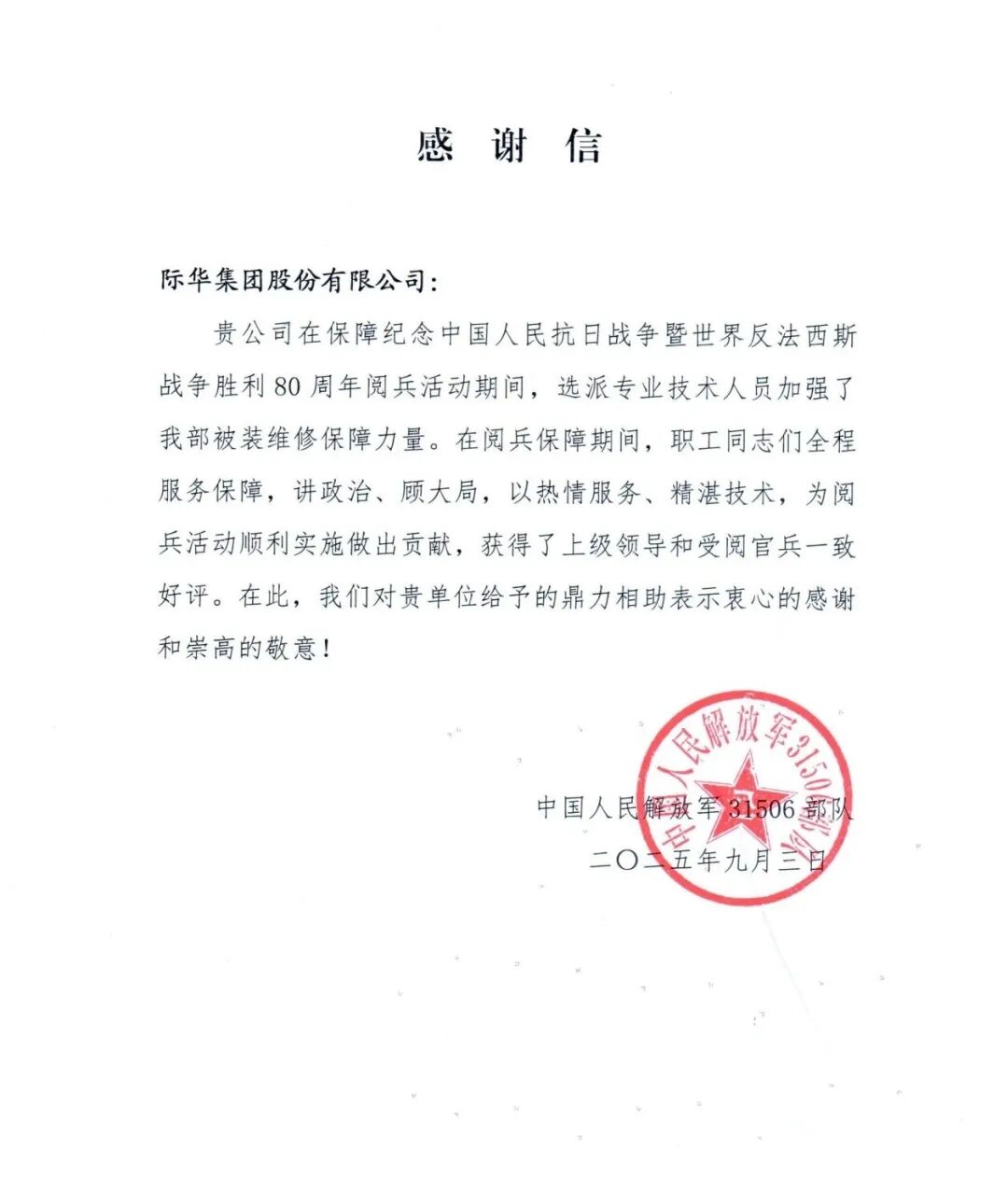 9月3日,中国人民抗日战争暨世界反法西斯战争胜利80周年纪念大会在北京天安门广场隆重举行,盛典背后,作为国家和军队忠诚可靠的保障力量,际华集团承担了阅兵服装、鞋靴和配套装备的主要保障任务。在集团公司党委部署和际华党委的领导下,共计完成了98951件/套的保障任务。生产任务之外,选派40余名业务骨干驻守阅兵村138天,全维度、系统化完成被装维修保障任务。